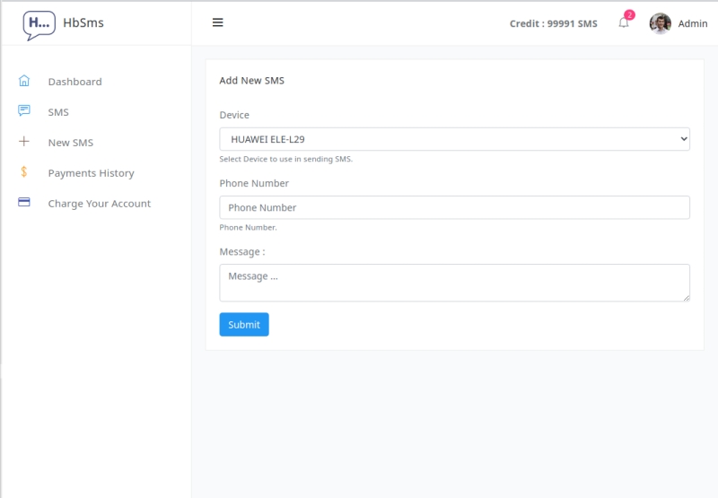 Go to dashboard and New SMS then select your device and add fill the form then hit send.